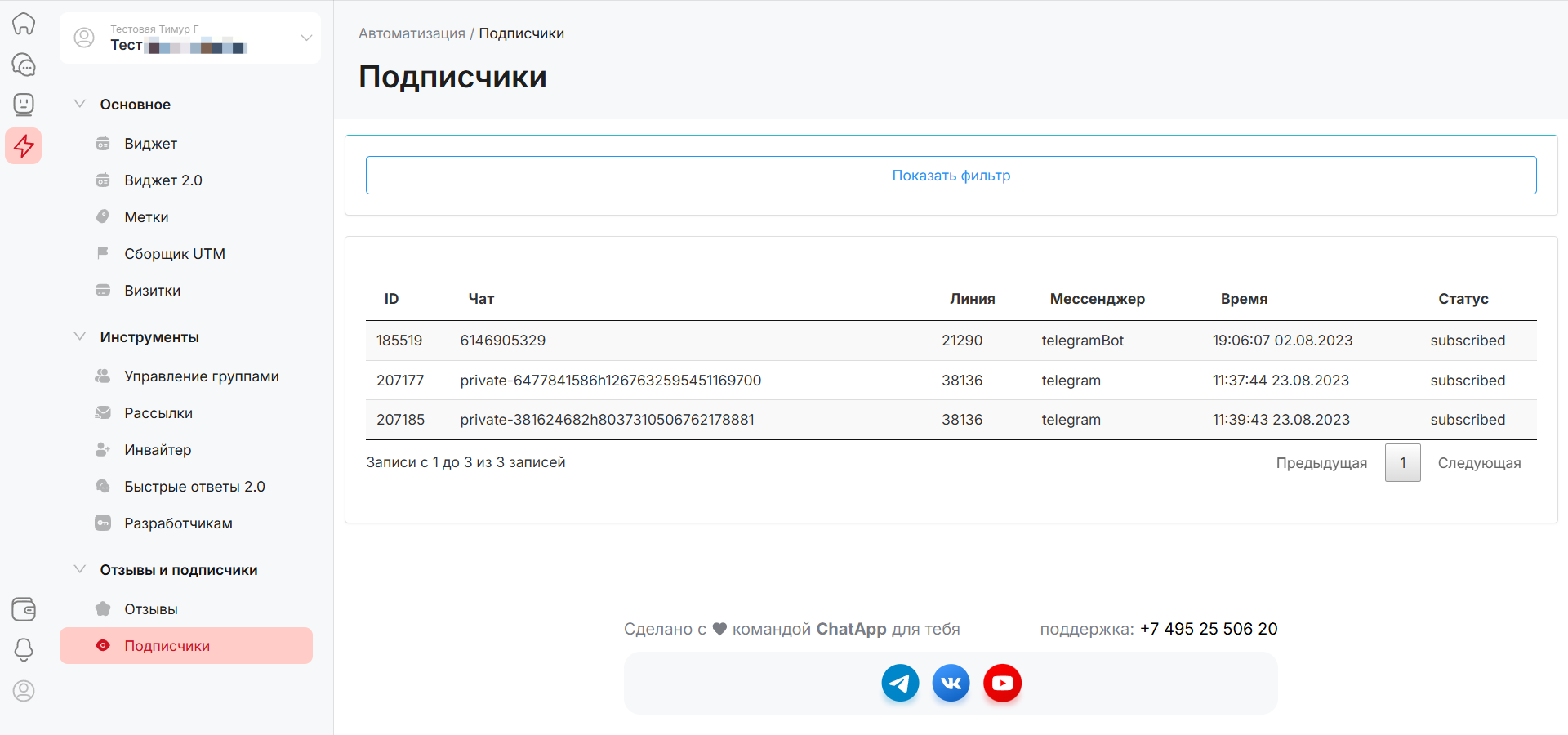 В таблице подписчиков закреплен ID подписчика; номер чата, в котором была отправлена команда «/Подписаться» или «/Отписаться»; мессенджер, а также статус подписки.