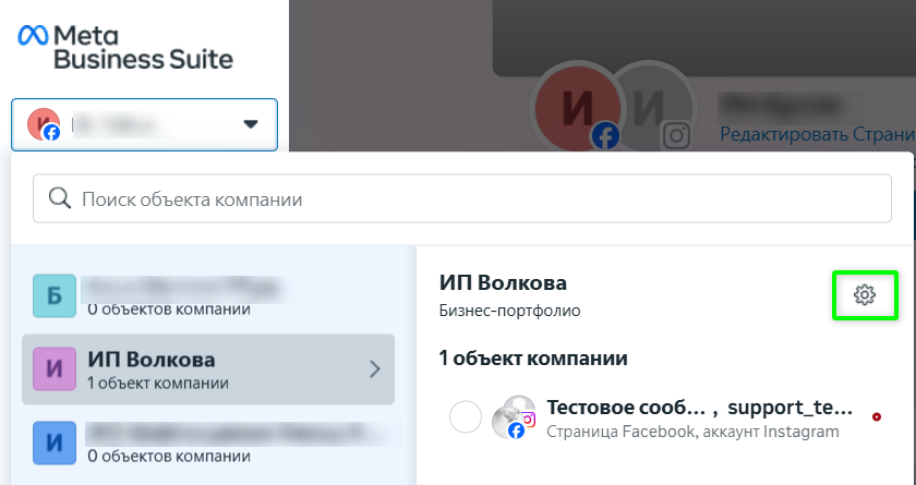 - На главной странице Meta Business Suite нажмите на плашку с названием компании → значок настроек.