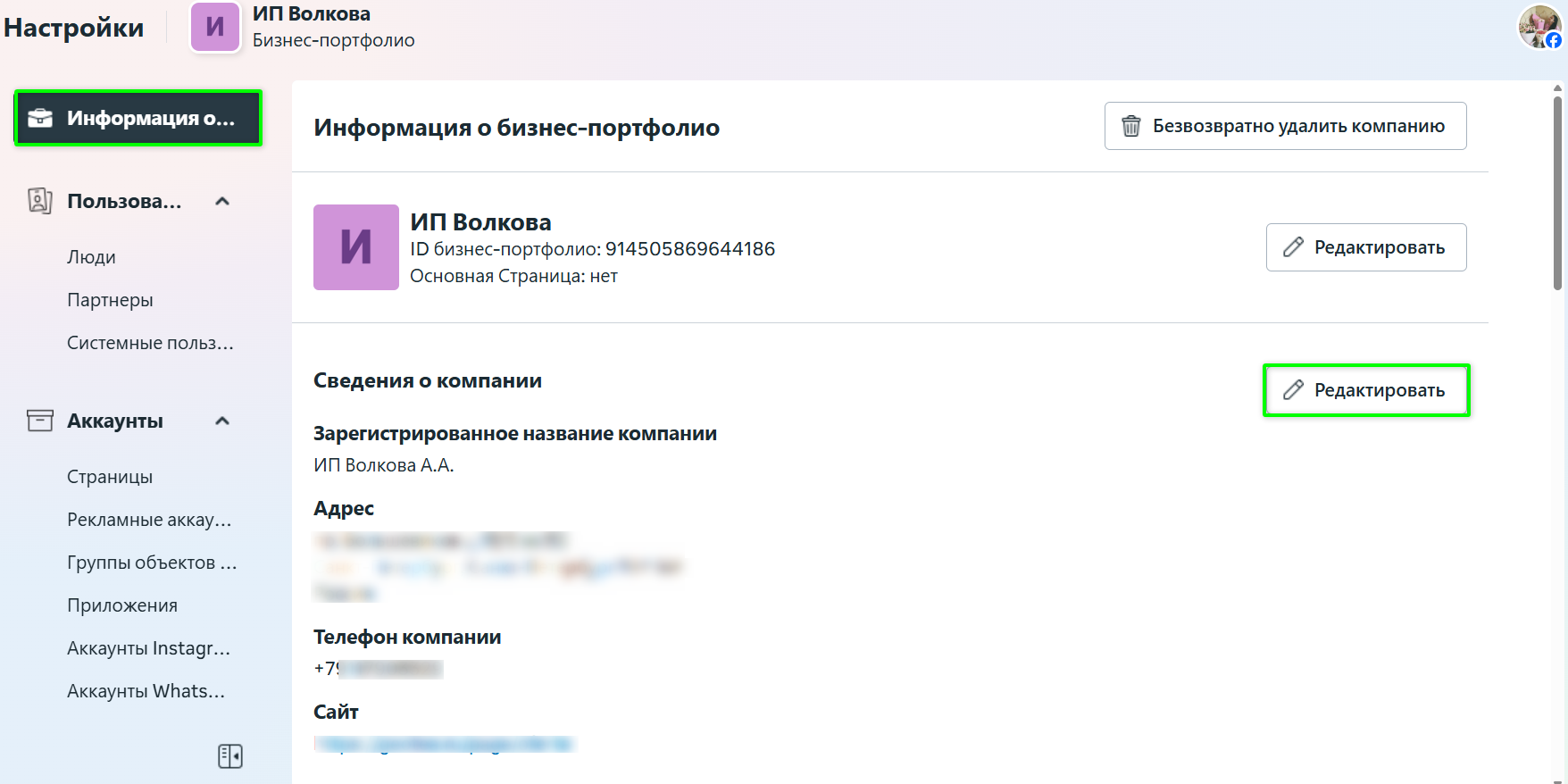 - Нажмите «Редактировать» и заполните сведения о компании.