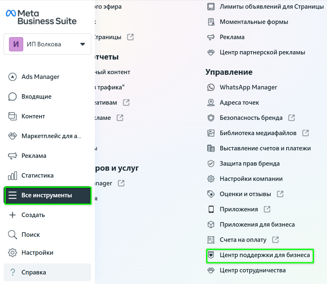 - откройте Все инструменты → Центр поддержки для бизнеса;