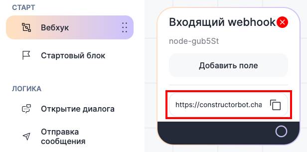 4. Скопируйте ссылку из блока «Входящий Webhook» в конструкторе ботов ChatApp и вставьте в поле «WEBHOOK URL»;