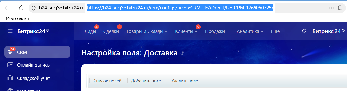Например, в ссылке https://b24-sucj3e.bitrix24.ru/crm/configs/fields/CRM_LEAD/edit/UF_CRM_1766050725/ ID поля — UF_CRM_1766050725.