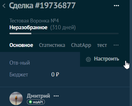 1. Зайдите в карточку сделки, контакта или компании и нажмите «Настроить».
