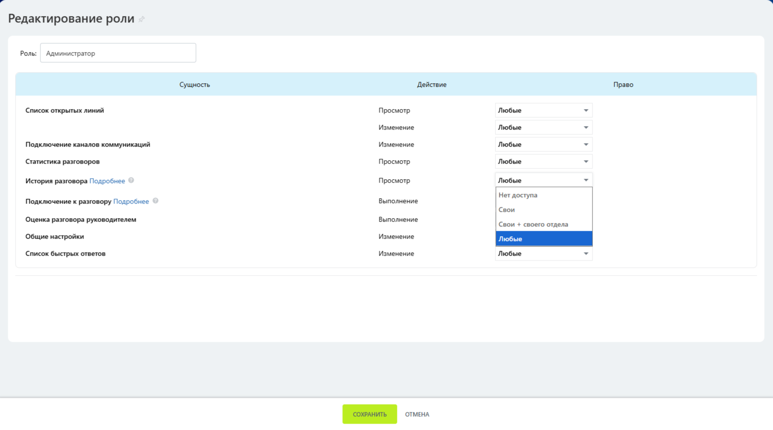 7. Присвойте роль нужному сотруднику или отделу, выбрав её из выпадающего списка ролей.