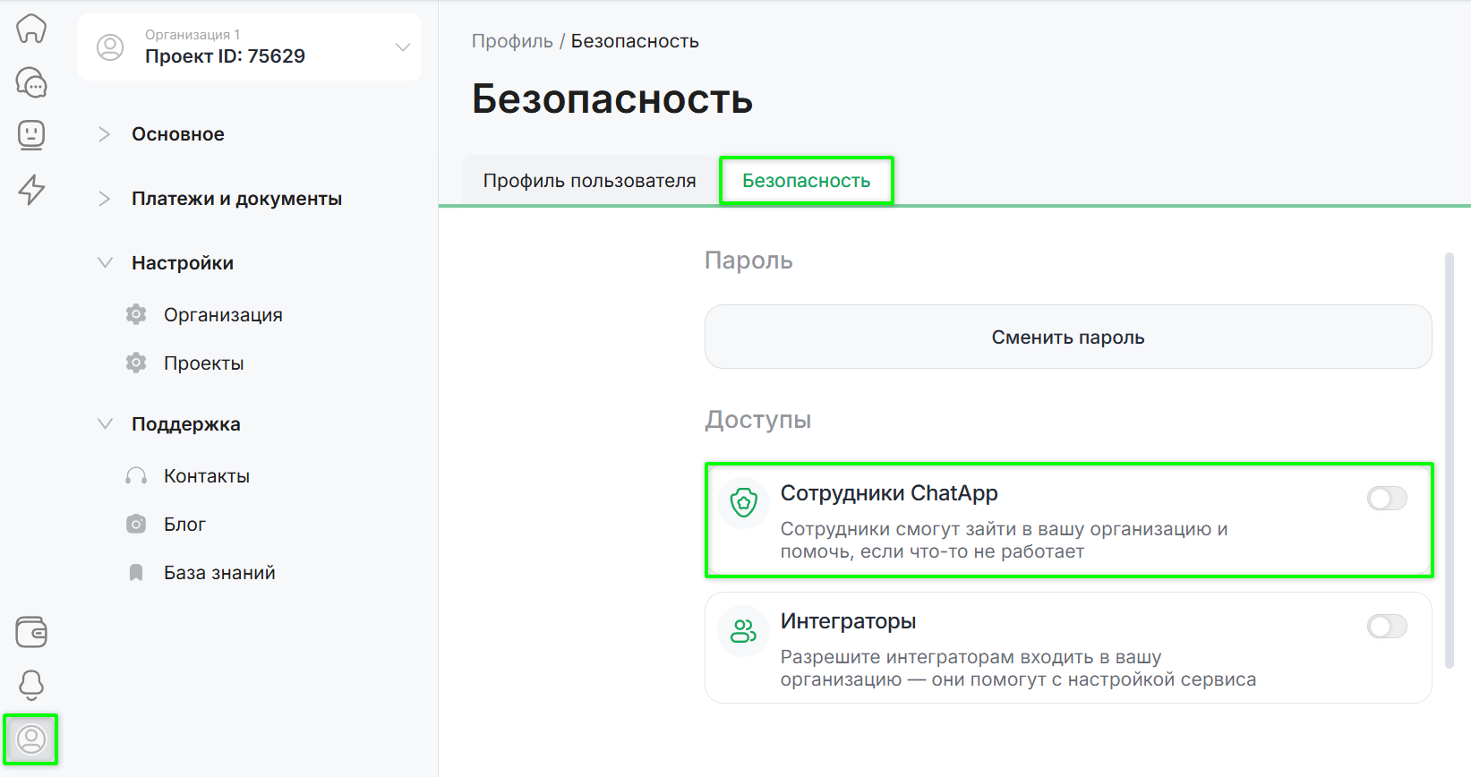 В разделе «Доступы» активируйте переключатель «Сотрудники ChatApp».