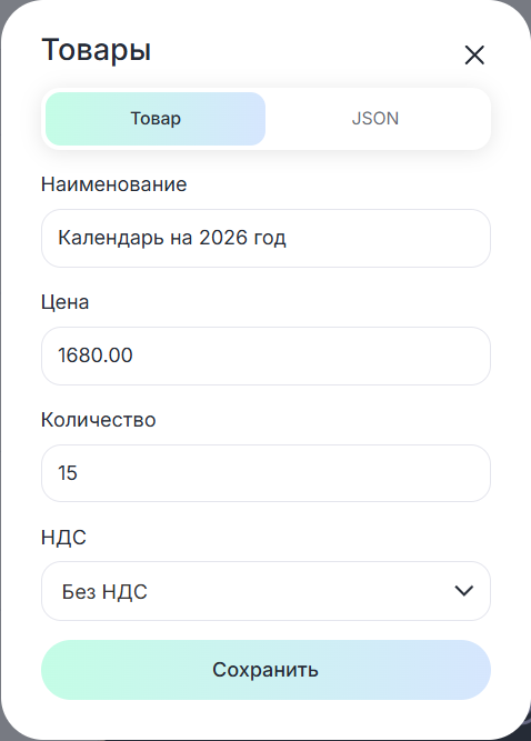 Во вкладке «JSON» можно ввести параметры товара в формате json.