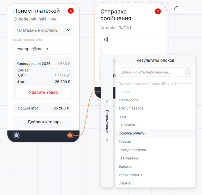 7. Чтобы отправить клиенту ссылку на оплату, добавьте блок «Отправка сообщения», введите двойные фигурные скобки «{{», откройте раздел «Результаты блоков» и выберите результат «Ссылка оплаты».