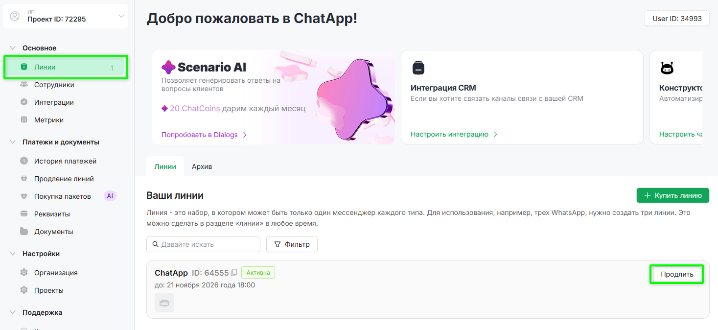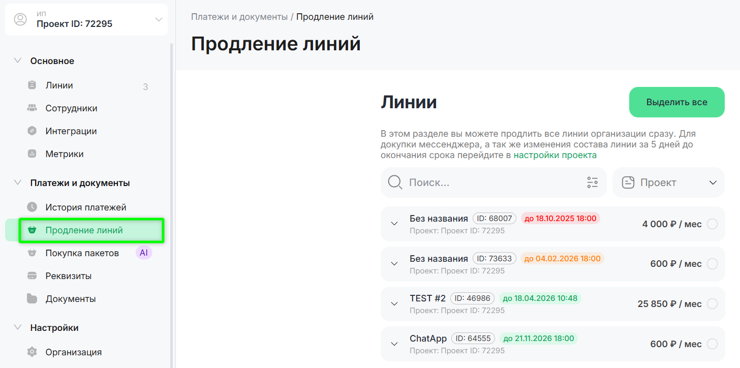 В разделе «Продление линий» доступно продление всех линий организации одним платежом. Добавление мессенджеров и изменение состава линии возможно не позднее чем за 5 дней до окончания срока в разделе «Линии».