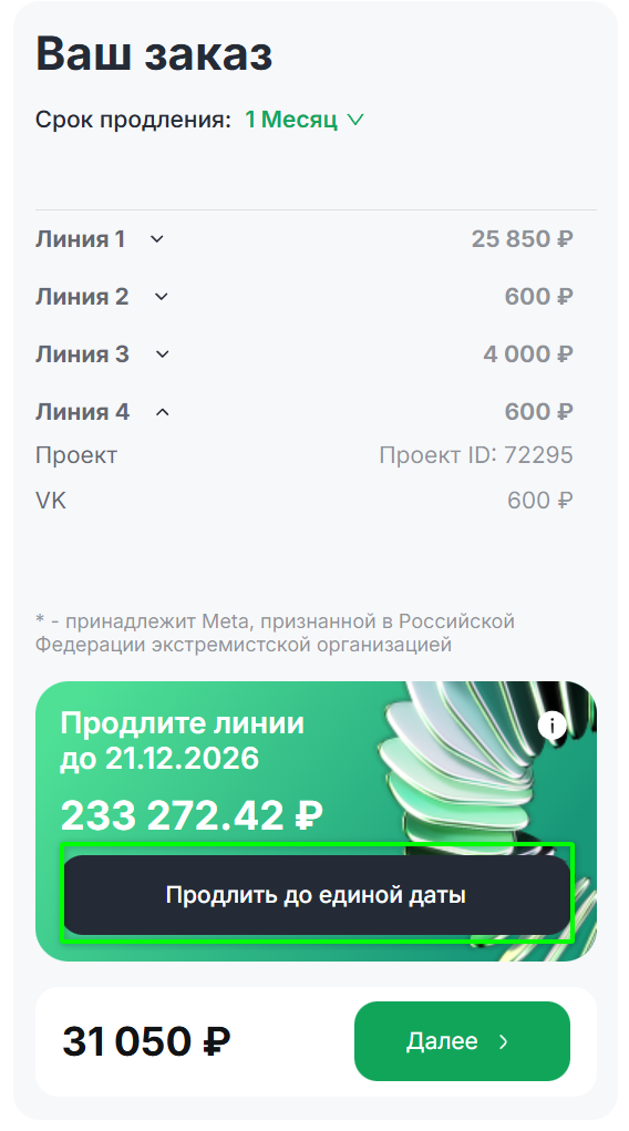 Если требуется продлить две или более линии одним платежом, переходите к следующей инструкции.