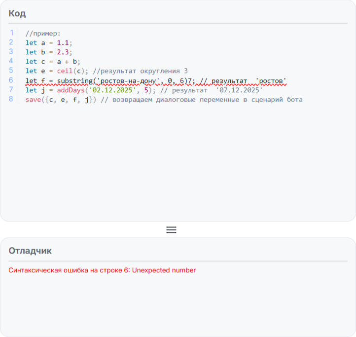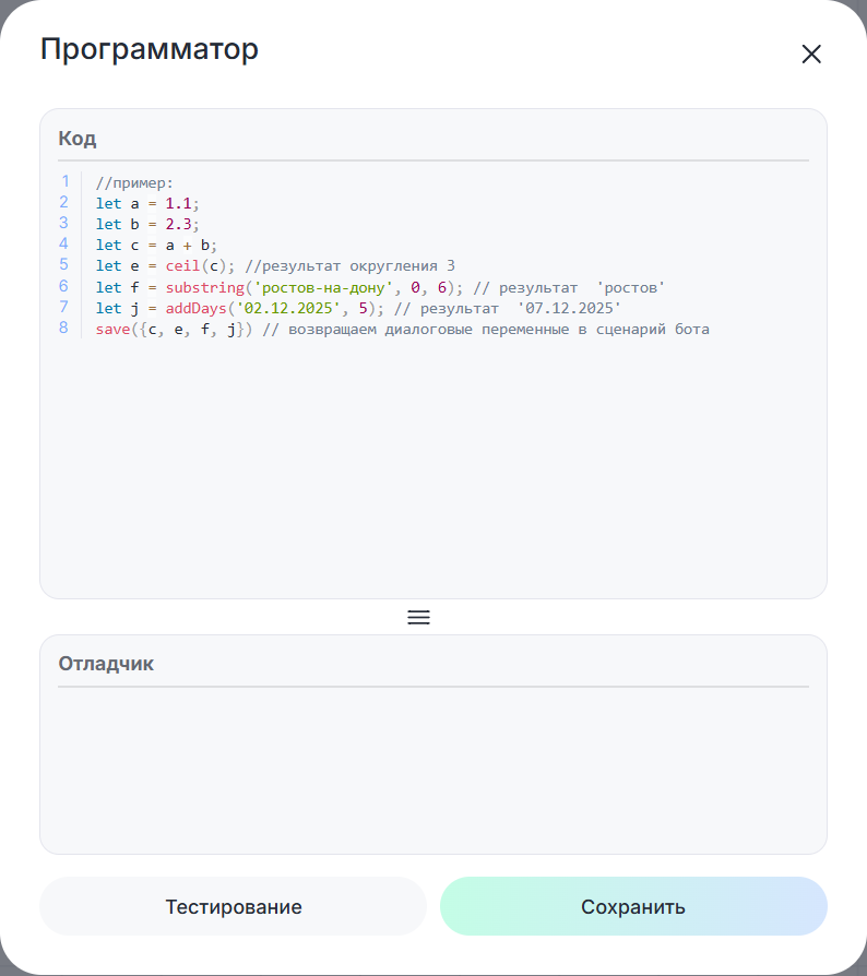 Блок производит математические и логические операции с числами, строками и переменными из доступных в Конструкторе ботов. Поддерживает код на языке JavaScript.