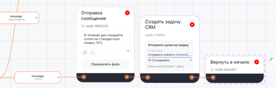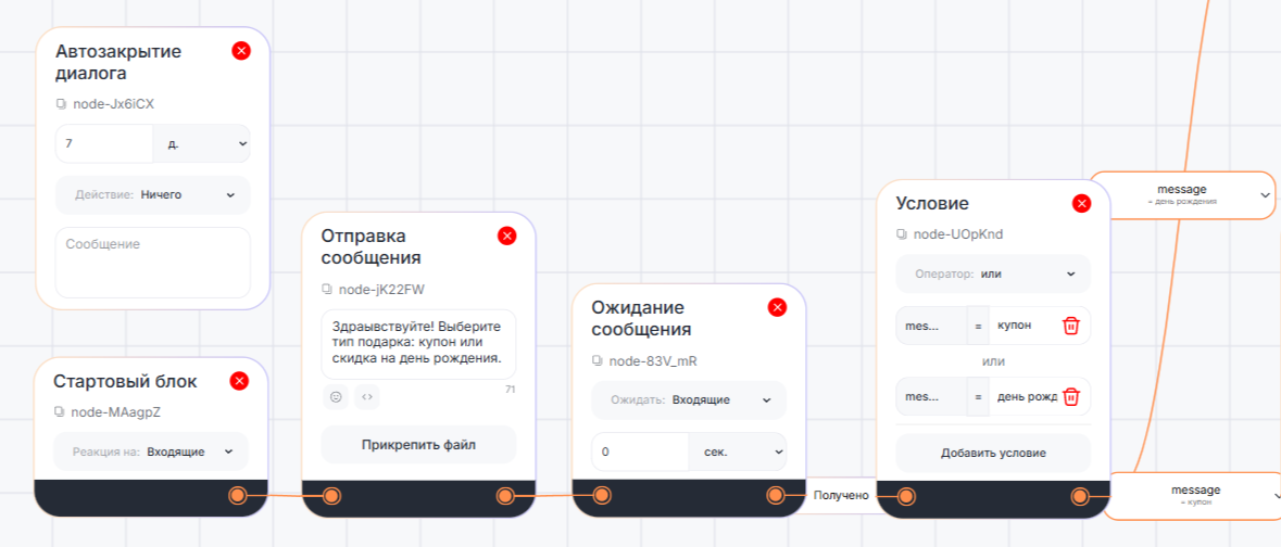 1. Клиенту предлагается тип подарка: купон или скидка на день рожденья. В блоке «Условие» указаны два варианта развития сценария.
