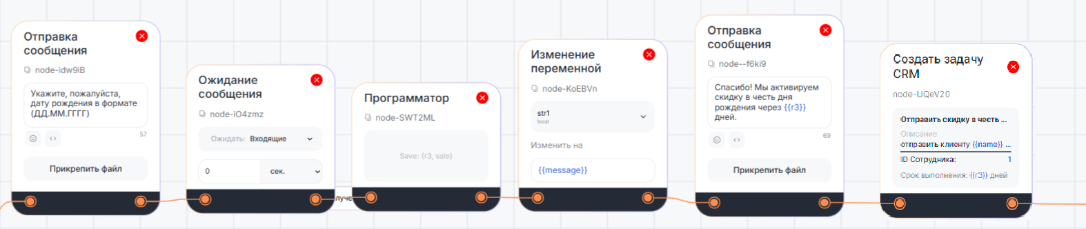 5. Клиенту отправляется сообщение с количеством дней до активации скидки — его дня рождения. Значение берется из переменной ‘{{r3}}’.