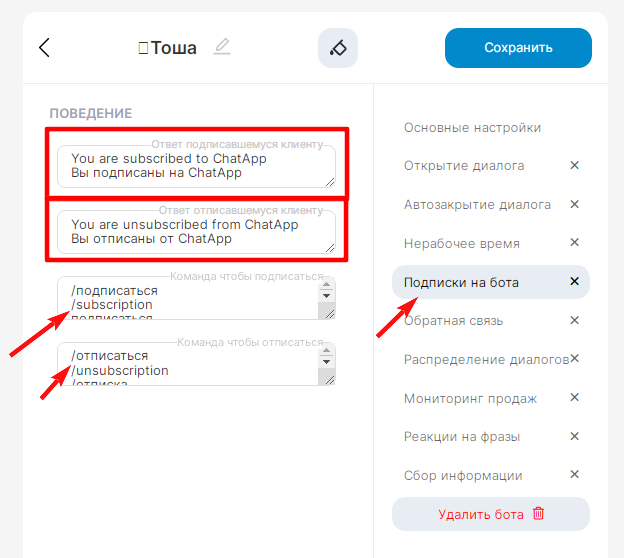 - Ответ бота отписавшемуся клиенту — фраза, которую бот отправит отписавшемуся клиенту. Например, можно постараться уговорить клиента остаться.