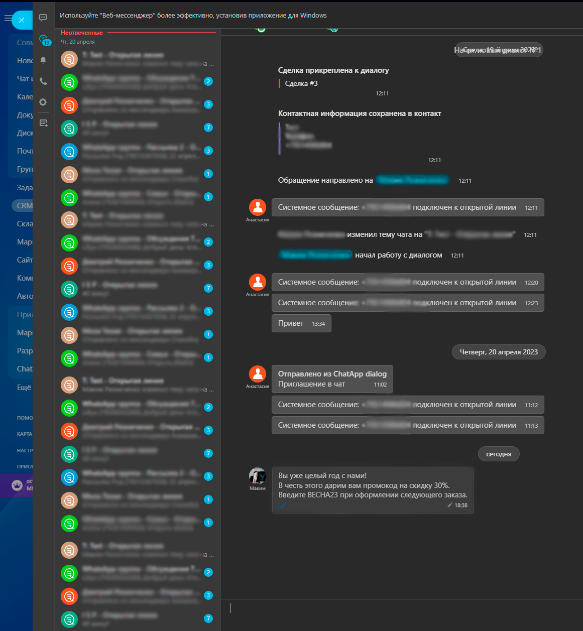 Представим что вы сделали рассылку на 250 человек. Конечно же у вас не открылось множество диалогов, потому что вы исключили автоматические сообщения в настройках коннектора. Клиенты начинают отвечать на рассылку, и чтобы им ответили как можно быстрее можно настроить очередь Ответственных за диалоги сотрудников: