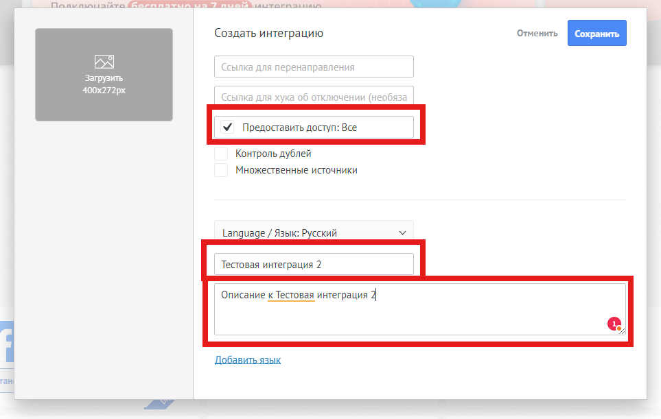 - Заполните поля «Название» и «Описание».