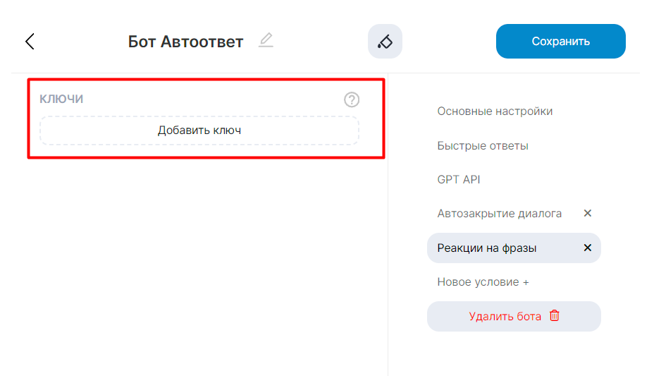 1. Перейдите в Основные настройки нужного бота — вкладка «Реакции на фразы». Как добавить эту вкладку, читайте в статье Реакция на фразы в сообщениях.