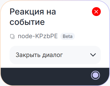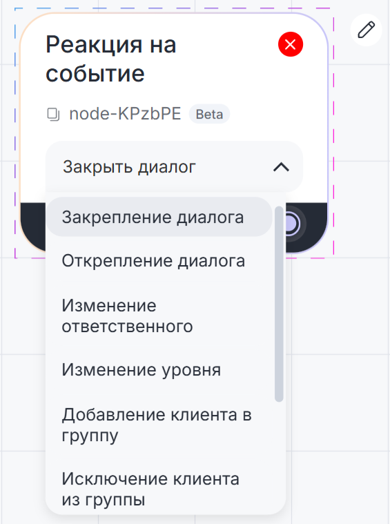 Блок «Реакция на событие» позволяет запускать сценарии или части сценария в ответ на события в системе ChatApp. Например, закрытие чата в Scenario Dialogs.