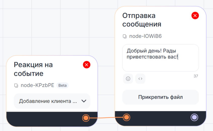 Например, если клиент пришлет файл — сработает блок «Реакция на событие» и бот запустит следующий блок «Отправить сообщение».