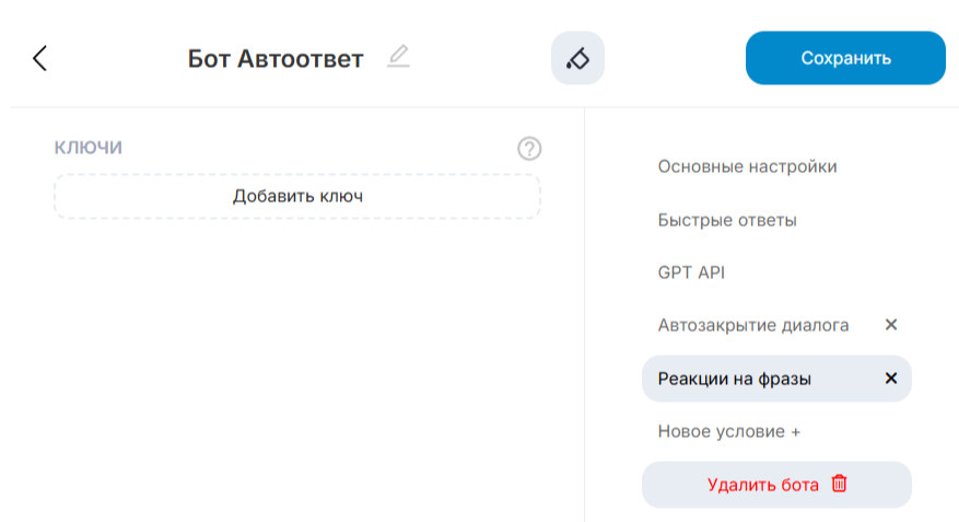 Тип реакции «Новое условие +» позволяет добавить реакцию на фразу — бот будет срабатывать на определенные «ключи» в сообщениях.