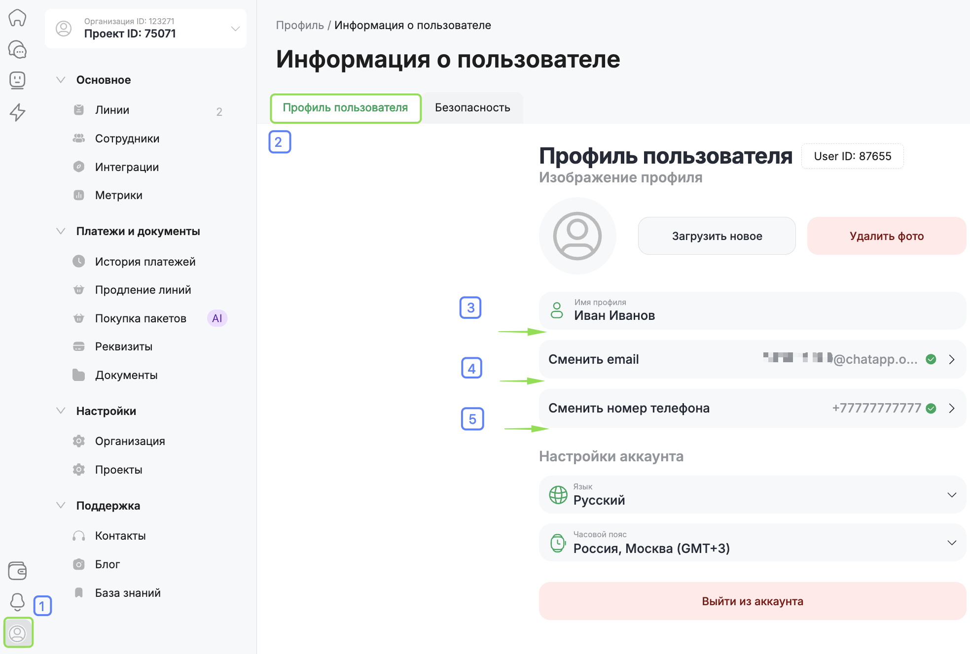 При смене email или номера телефона необходимо подтвердить новые данные с помощью кода верификации.