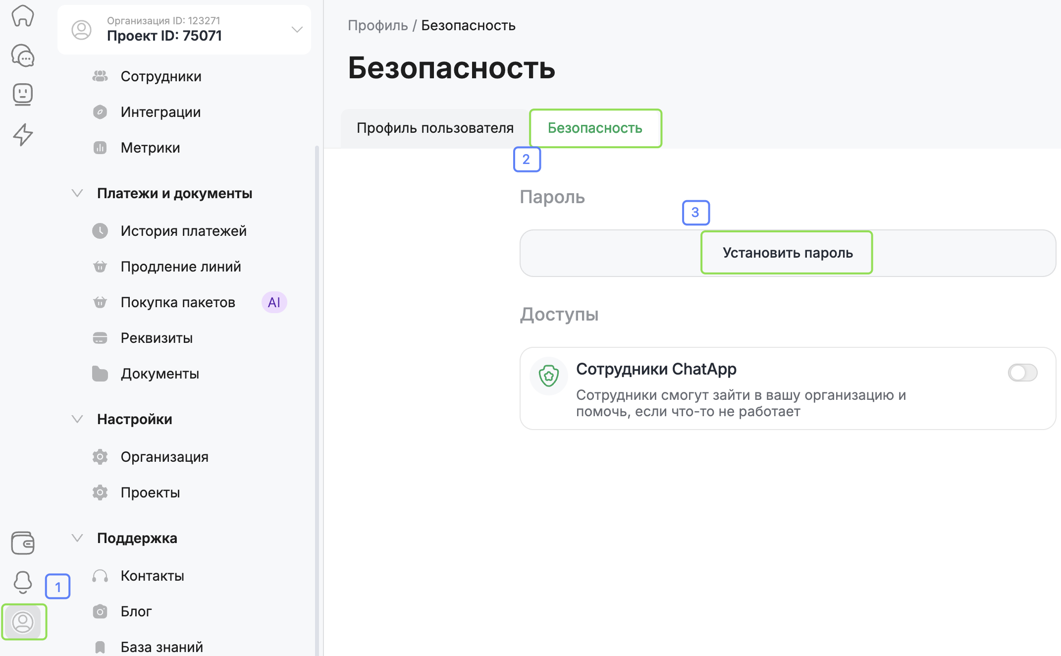 Откройте профиль пользователя (иконка профиля в левом нижнем углу) → раздел «Безопасность» → «Установить пароль» укажите текущий и новый пароль.