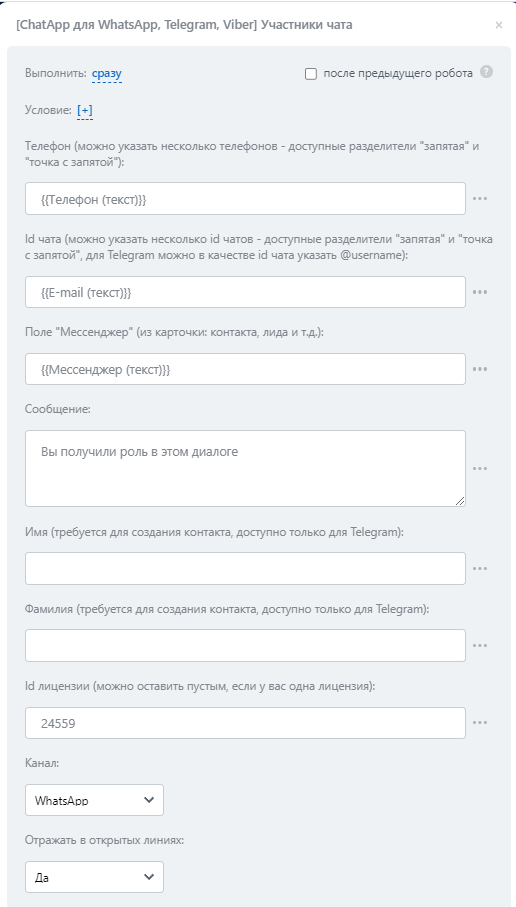 - ID сотрудника CRM — подставить id сотрудника из сделки или лида, которого следует прикрепить или открепить в участников чата.