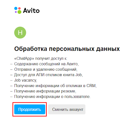 4. После автоматического перехода на сайт Avito нажмите «Продолжить».