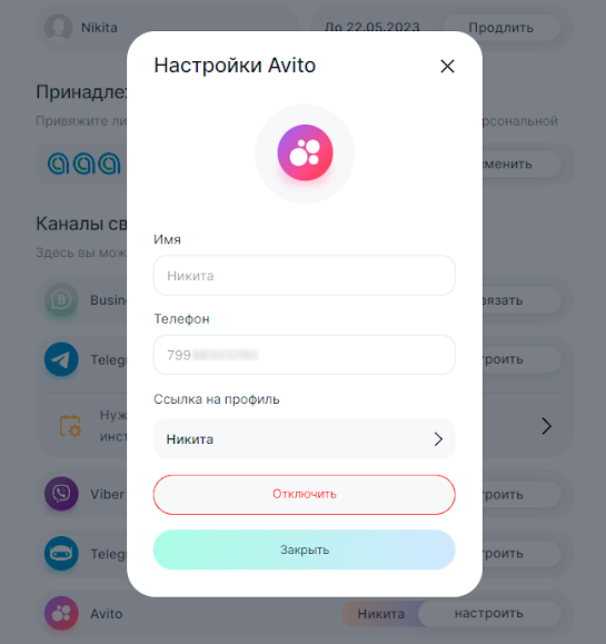 6. В настройках можно посмотреть номер телефона, к которому подключен Avito, имя владельца аккаунта, и получить ссылку на профиль. А также отключить аккаунт Avito.