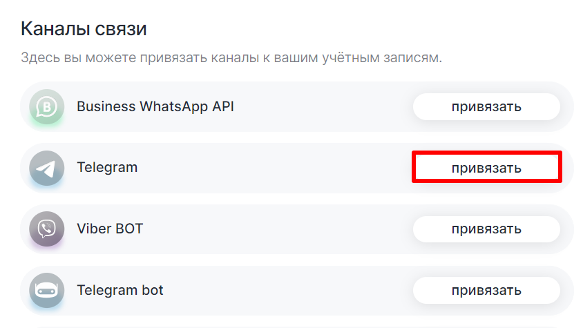 2. Напротив Telegram нажмите кнопку «Привязать».