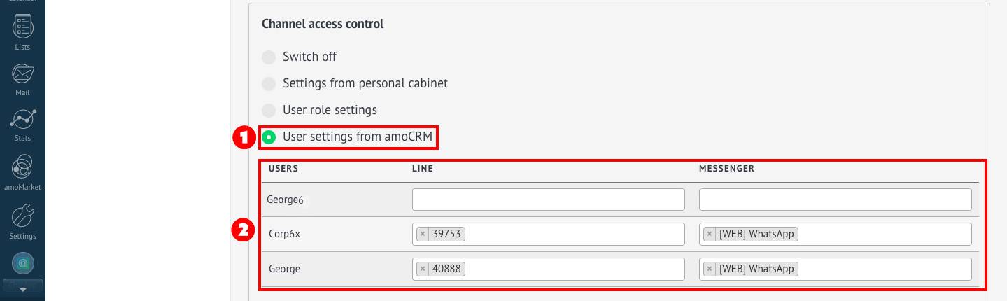 3. In the “User settings from amoCRM” section, set the lines to which each role has access;