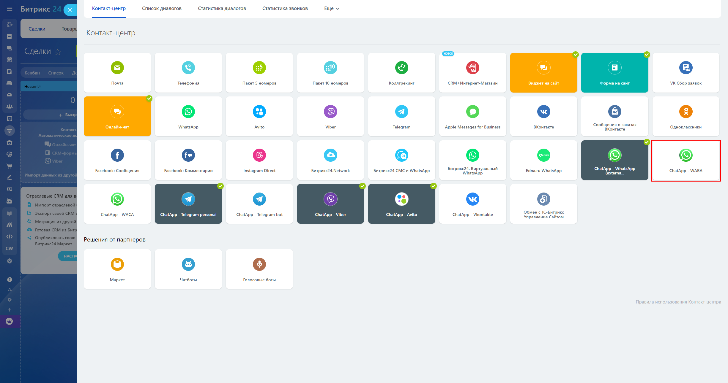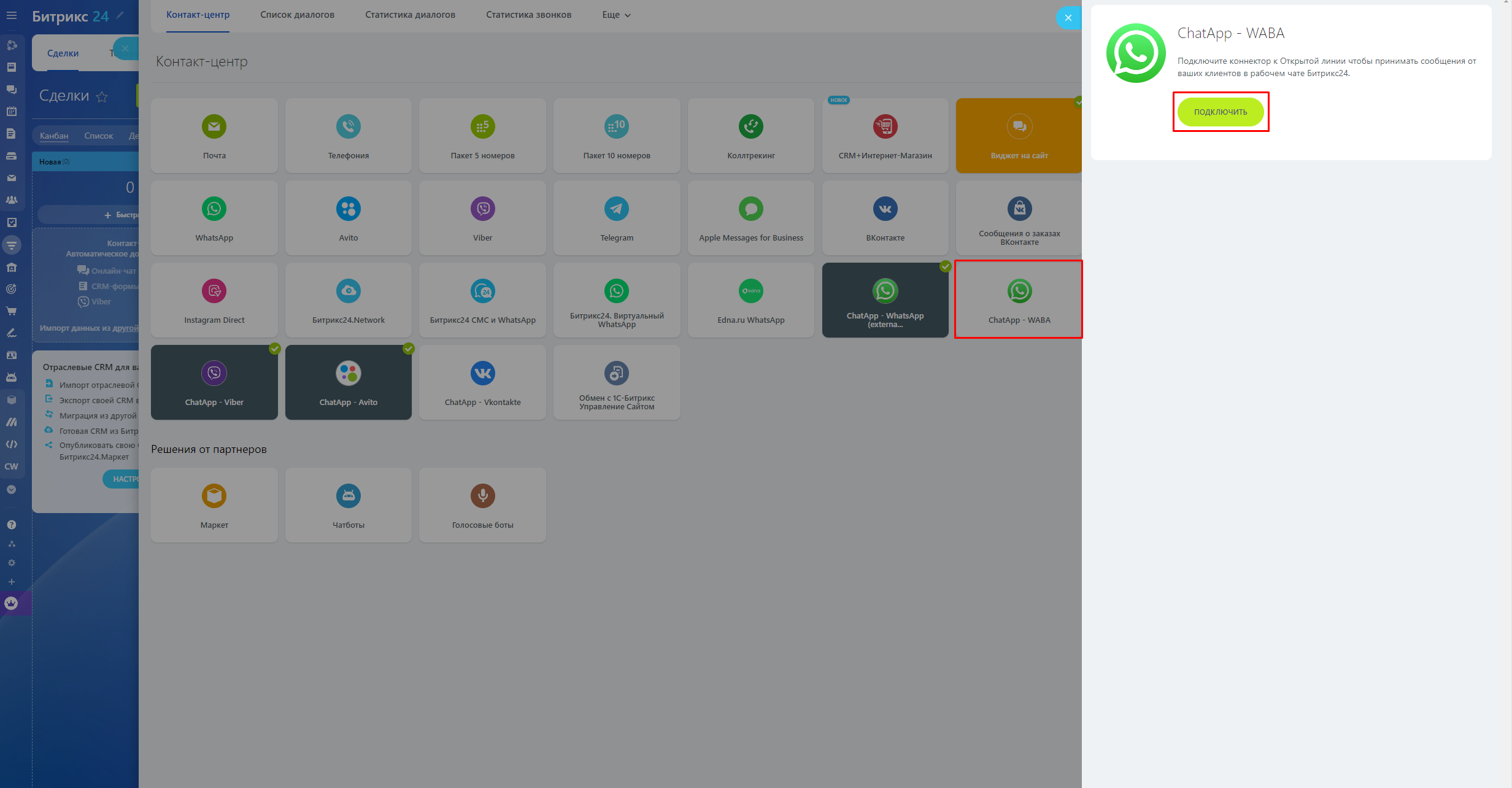 1. В разделе «Контакт-центр» в Битрикс24, нажмите на коннектор «ChatApp — WABA».