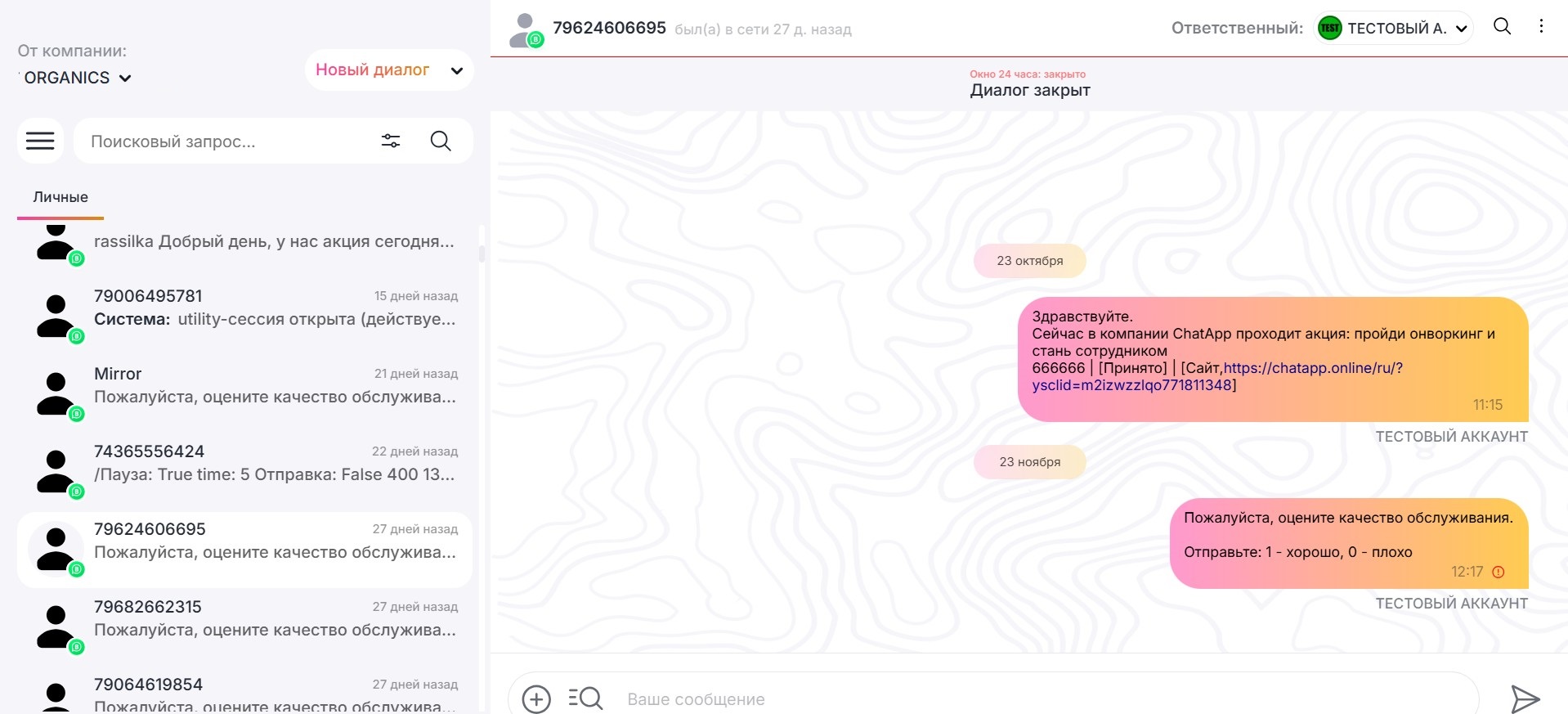 Сервис умеет работать без CRM. Сотрудники компании могут отвечать на обращения клиентов в едином окне ChatApp Dialogs.