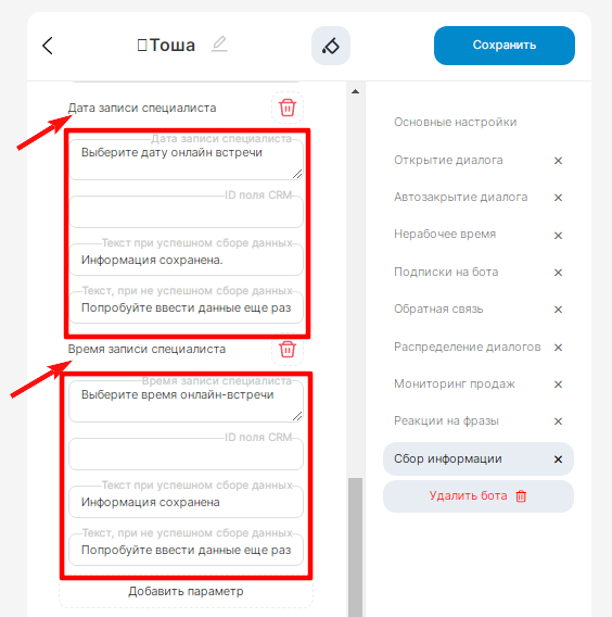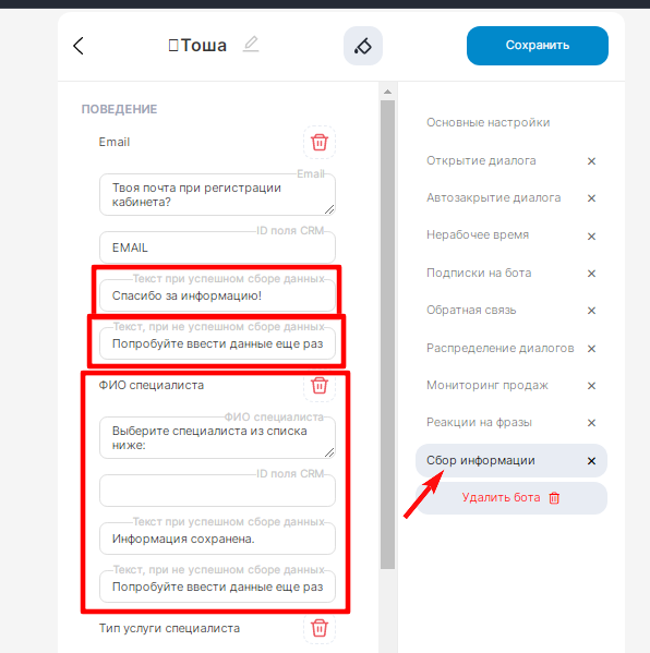 С помощью бота система может запрашивать дополнительную информацию у клиента. Для этого в основных настройках бота перейдите в раздел «Сбор информации» и настройте его для сбора пользовательских данных. Здесь можно: