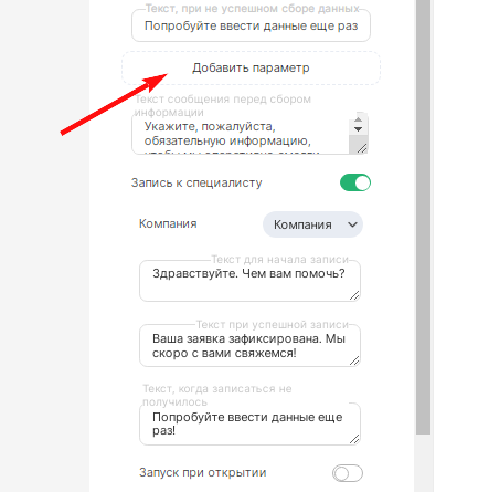 5. Также можно выбрать один из дополнительных параметров, запрашиваемых у пользователя ботом, или написать свой, нажав на вкладку «Добавить параметр»: