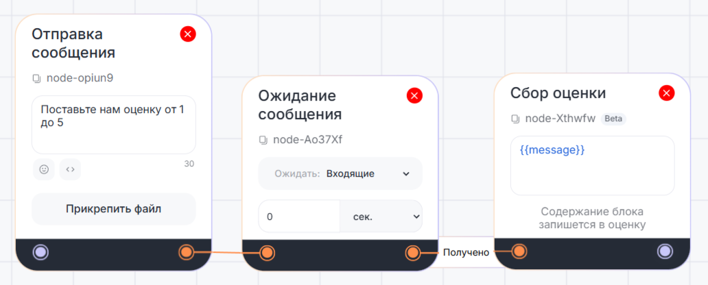 2. Добавьте блоки «Сбор оценки» и «Ожидание сообщения», чтобы бот дождался сообщения от клиента.