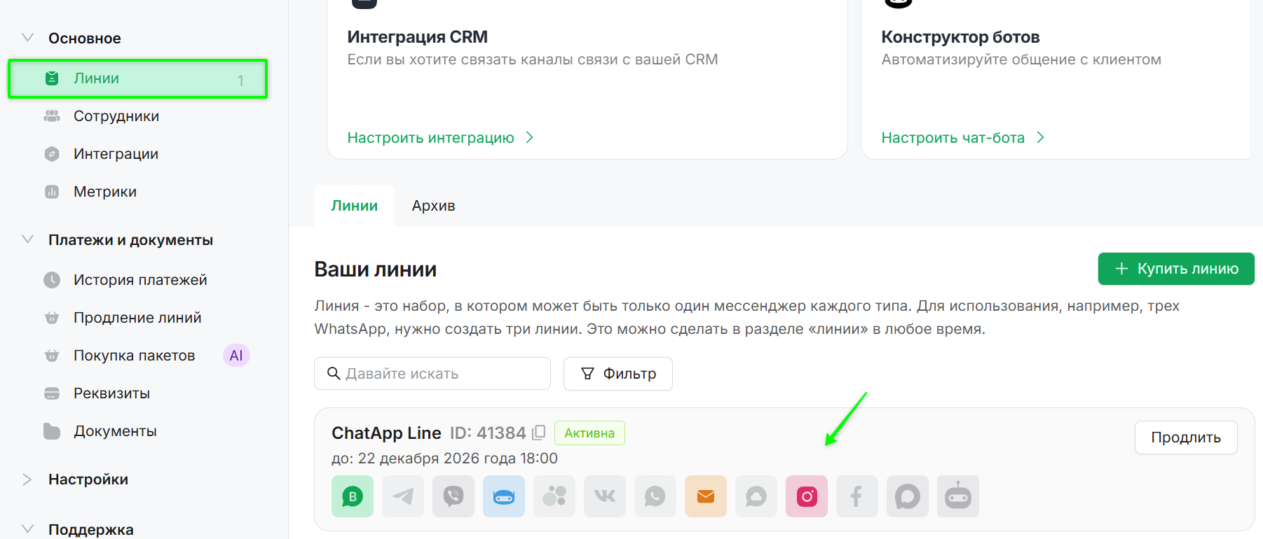 - Перейдите в Личный кабинет ChatApp, выберите нужный Проект и откройте раздел «Линии».