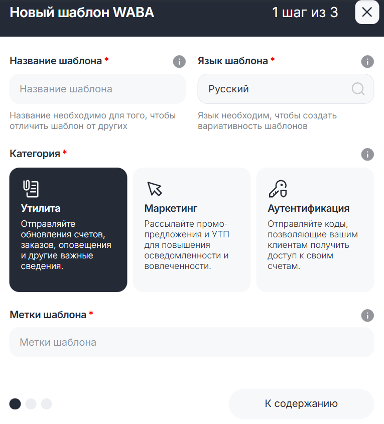 - Укажите Название шаблона, Язык шаблона, Категорию, Метки шаблона и нажмите “К содержанию”