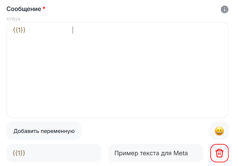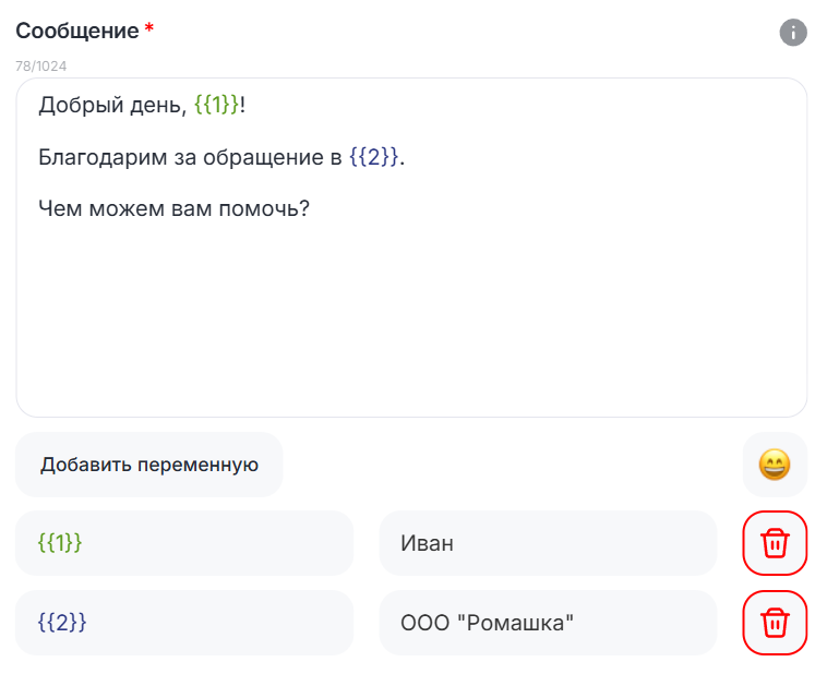 Переменные указываются в формате {{1}}, {{2}} и т.д.