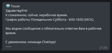 4. В тексте укажите время работы компании с учетом обеденного перерыва. Клиент, получив соответствующее сообщение от бота, будет знать, когда нужно будет обратиться повторно.