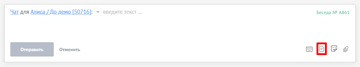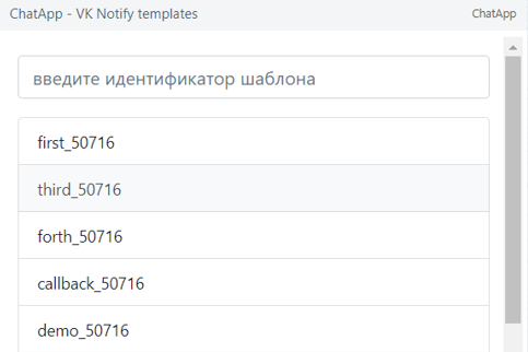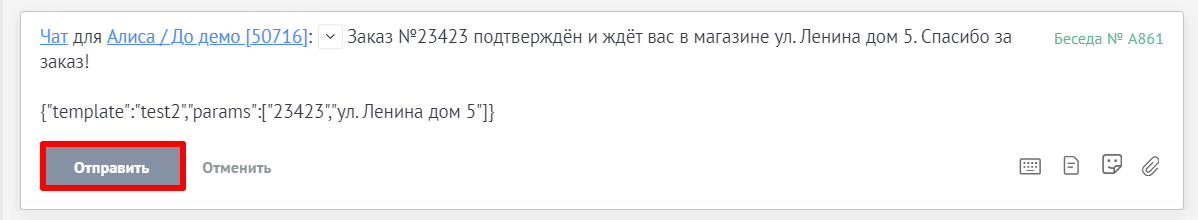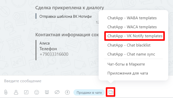 В открытой линии, в чате с клиентом, нажмите кнопку с двумя окнами → «ChatApp – VK Notify templates» → Выберите нужный шаблон, при наличии переменных заполните их → нажмите «Отправить».