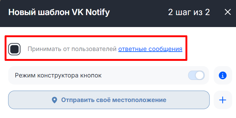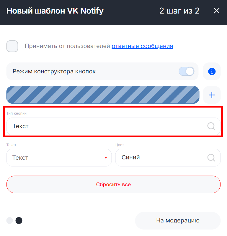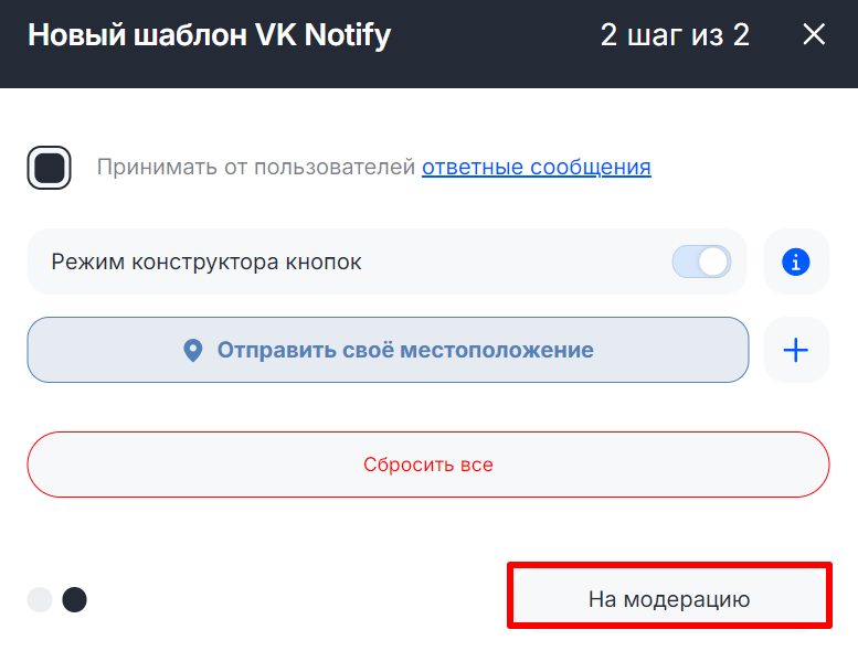 8. Чтобы пользователи имели возможность отвечать на ваши сообщения, включите «Принимать от пользователей ответные сообщения». В таком случае сервисные сообщения будут приходить в личные сообщения ВКонтакте. Если опция «Принимать от пользователей ответные сообщения» отключена — сообщения будут приходить как бизнес-уведомления без возможности ответа. Чтобы отправить шаблон на согласование с ВКонтакте, нажмите «На модерацию».