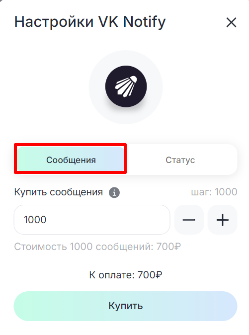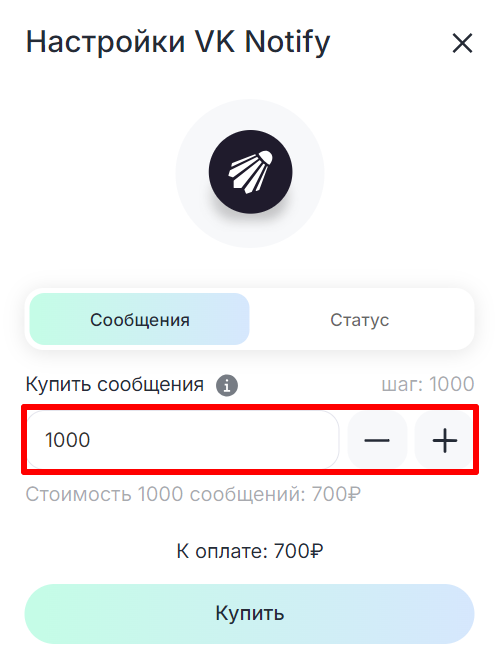 - Выберите количество сообщений для покупки. Число должно быть кратно 1000.