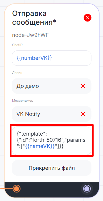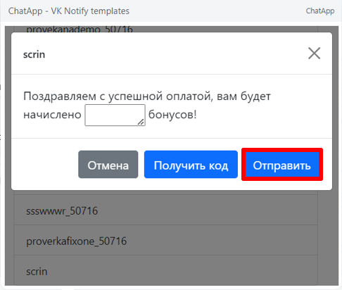 В окне отправки нажмите на значок листа → выберите линию с подключённым VK Notify → затем шаблон → Заполните переменные → нажмите «Вставить» → затем «Отправить».