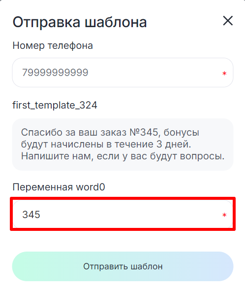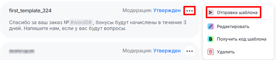 - Нажмите «Перейти к шаблонам». Напротив нужного шаблона нажмите на три точки — «Отправка шаблона». В окне отправки шаблона укажите телефон получателя в поле «Номер телефона». Укажите значение переменных в поле «Переменная».