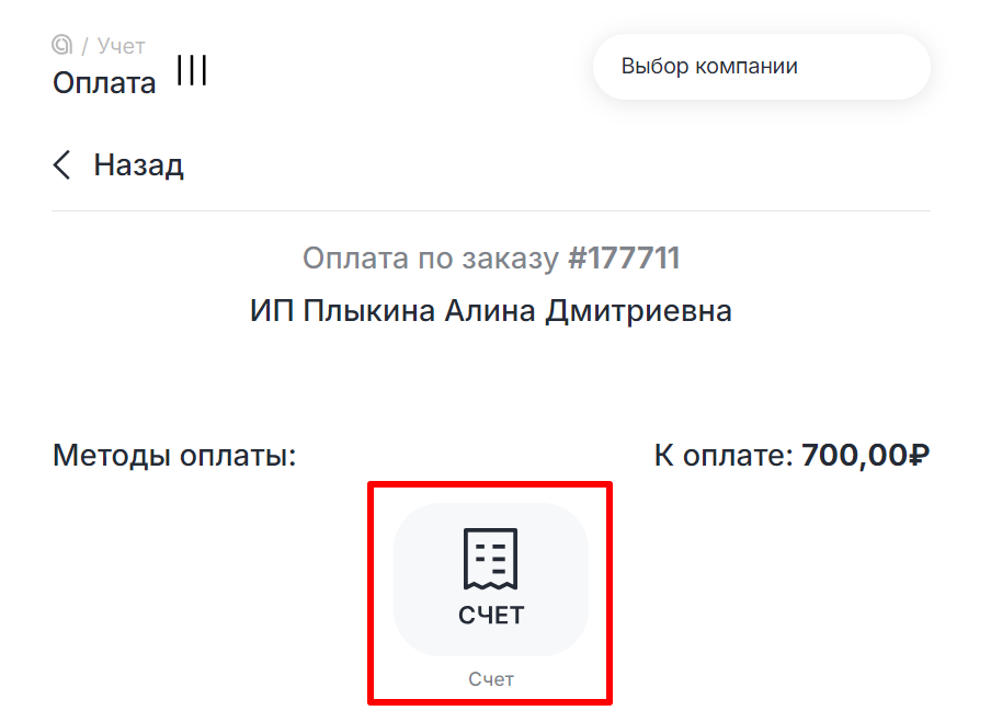 - Выберите метод оплаты. Доступна только оплата по счету.