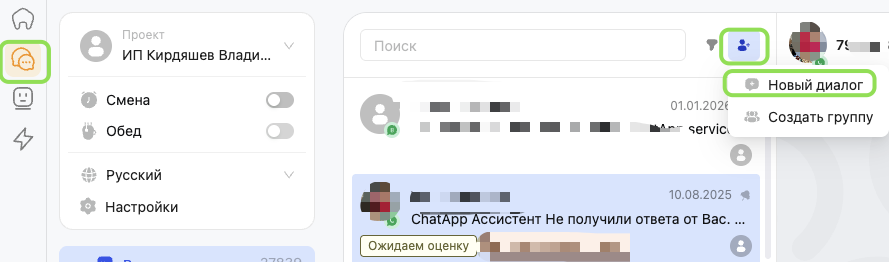 1. Перейдите в раздел Scenario Dialogs в левом боковом меню личного кабинета и нажмите «Новый диалог». Выберите линию, на которой подключён VK Notify → мессенджер VK Notify → ответственного за диалог → номер телефона пользователя. Затем выберите шаблон из списка и нажмите «Начать диалог».