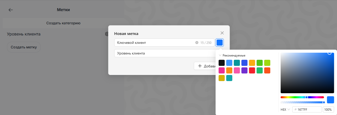 5. Введите название метки, цвет фона и нажмите «Добавить».