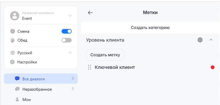 В ChatApp реализованы метки, позволяющие выделять диалоги по типу важности и срочности, типам сегментации клиентов или лидов, назначать свои уникальные категории — это позволяет сотрудникам моментально видеть изменения в чатах, эффективнее работать с диалогами и рациональнее распределять время их обработки.