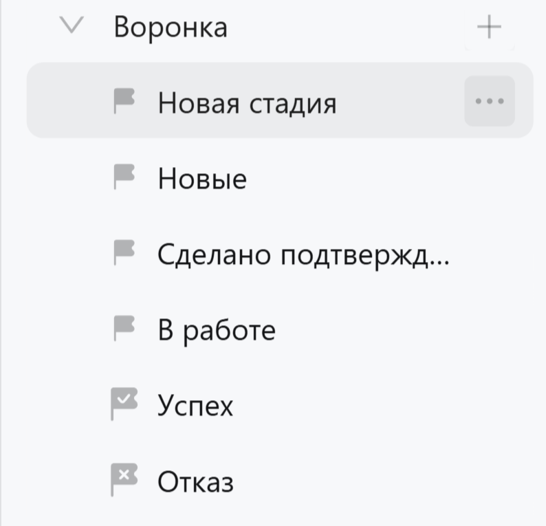 Для редактирования стадии наведите на нее курсор и нажмите на 3 точки справа, откроется меню: