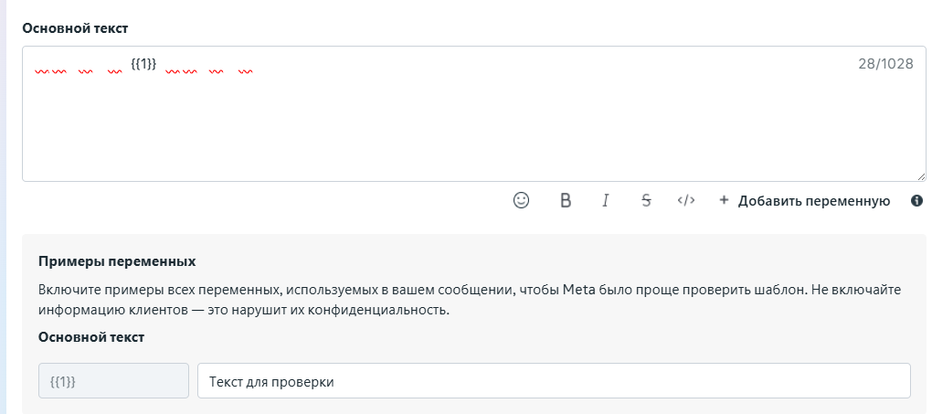Если шаблон содержит медиаконтент (изображение, видео или документ), необходимо обязательно указать тестовый медиафайл на этапе создания шаблона.